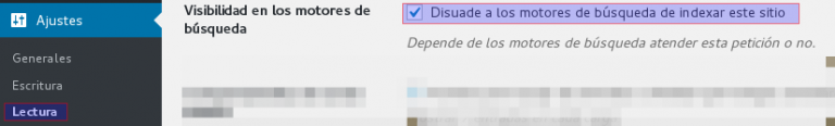 • Vamos a bloquear el blog para que no sea indexado desde los buscadores de Internet hasta que no esté «presentable». Lo puedes hacer desde Administración del sitio, seleccionando en Ajustes > Lectura
