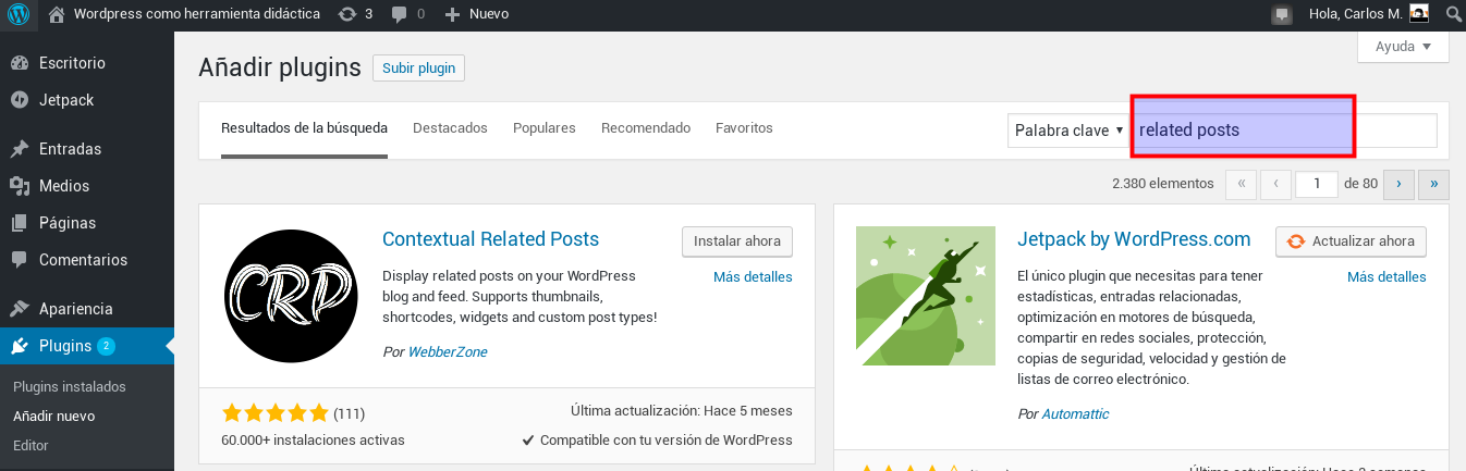 Buscamos «Related posts» para que nos liste todos los plugins que hacen eso.