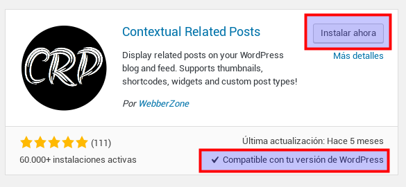 En mi caso, voy a probar con el primer plugin que me sale «Contextual Related Posts» que, como se puede ver, se lo ha instalado mucha gente y lo han valorado bastante bien. Es compatible con mi versión de WordPress, por lo que le doy a Instalar.