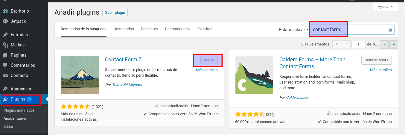 Como antes, voy a la sección Plugins > Agregar nuevo y le doy a buscar «Contact form». Yo voy a instalar el plugin Contact Form 7, que es bastante completo.