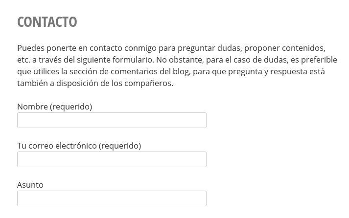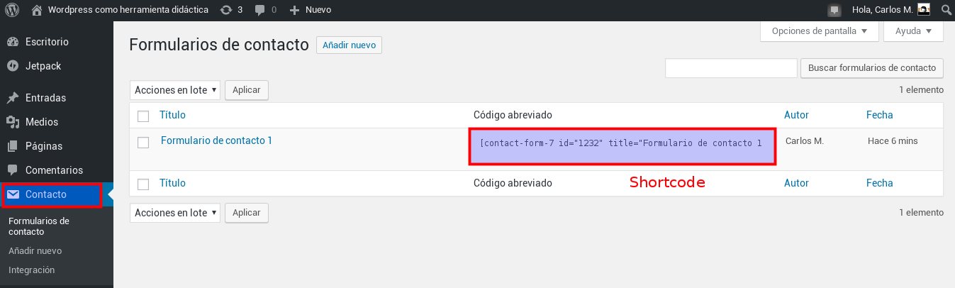 Pues nada, para que ese formulario se muestre en la web, tan sólo tengo que copiar el shortcode (recuerda, un código entre corchetes) en la sección que quiera (entrada, widget, página). En mi caso, voy a ponerlo en la sección «Contacto».
