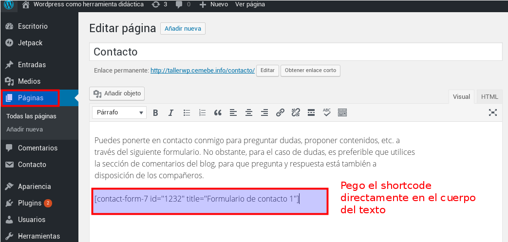 Pegando shortcode en una página