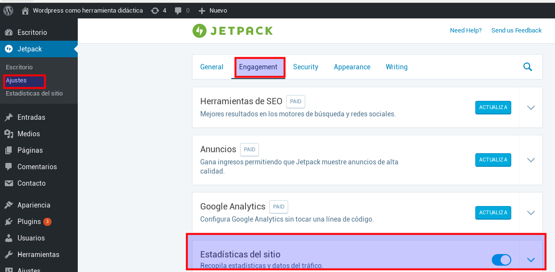 Para activar la opción de monitorización tengo que ir a ajustes y en el apartado engagement activar la opción Estadísticas del sitio.